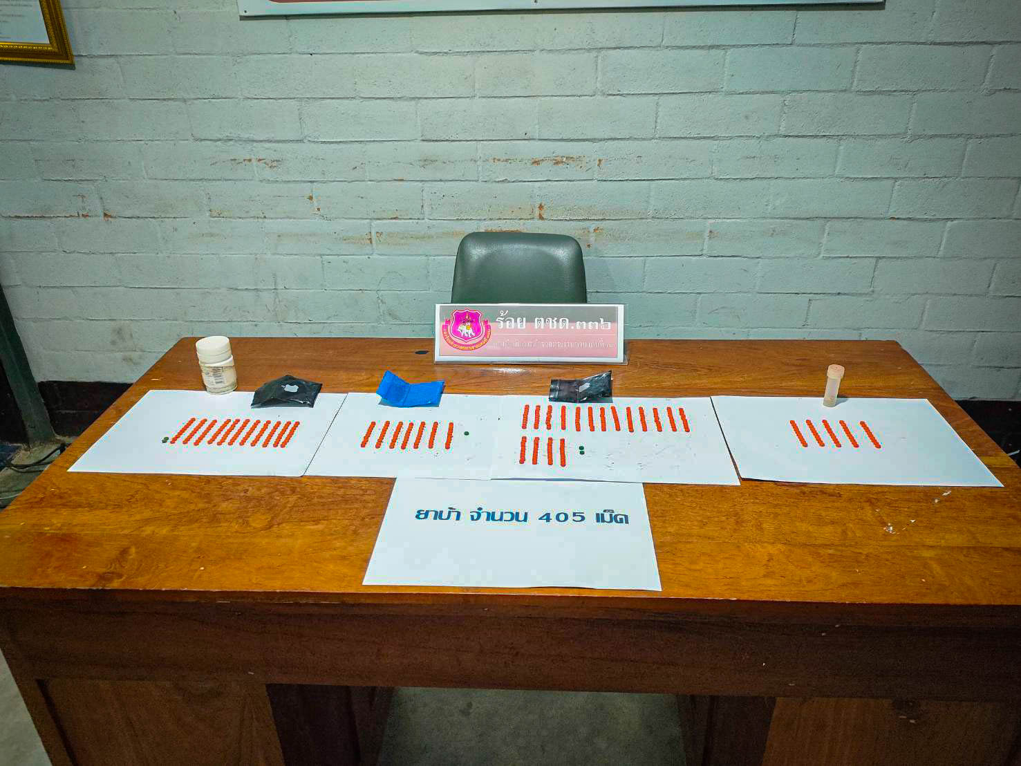 พร้อมด้วยของกลาง ยาเสพติดให้โทษประเภทที่ ๑ เมทแอมเฟตามีน (ยาบ้า) จำนวน ๔๐๕ เม็ด