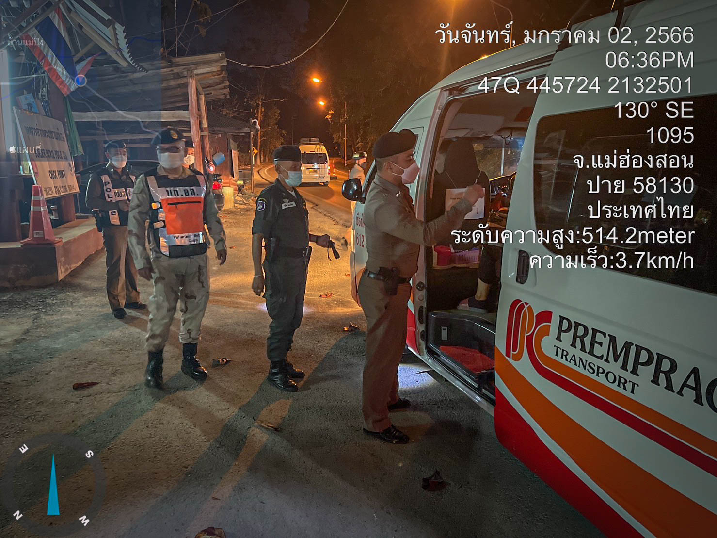 เมื่อ ๐๒๑๘๓๐ ม.ค.๖๖ โดยการอำนวยการของ พ.ต.ท.ธวัชชัย สุรินต๊ะ ผบ.ร้อย ตชด.๓๓๖ มอบหมายให้ ร.ต.ต.วิเชียร พรมรัตน์ รอง สว.(ป) กก.ตชด.๓๓/ หน.จุดตรวจแม่ปิง ร้อย ตชด.๓๓๖ พร้อมกำลังพลรวม ๔ นาย ร่วมกับ นายพิเชษฐ พุ่มนวน ปลัดอำเภอ งานป้องกัน อ.ปาย และ พ.ต.ท.นพคุณ อรรถธรรมกุล สวป. สภ.ปาย ได้ตั้งจุดตรวจ เพื่อเป็นการป้องกันและลดอุบัติเหตุทางถนนแก่นักท่องเที่ยวที่เดินทางเข้าออกในพื้นที่ จว.แม่ฮ่องสอน ในช่วงเทศกาลปีใหม่ ๒๕๖๖ บริเวณหน้าจุดตรวจจุดสกัดแม่ปิง บนถนนทางหลวงหมายเลข ๑๐๙๕ ต.แม่ฮี้ อ.ปาย จว.แม่ฮ่องสอน