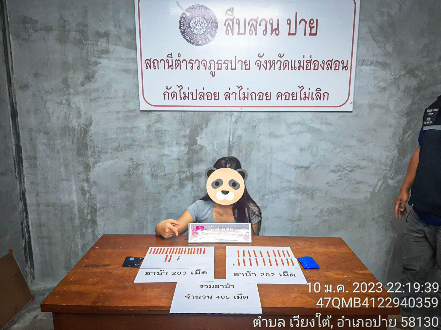ได้ร่วมกันจับกุม น.ส.กันฐิกา วังทูล (อายุ ๓๐ ปี) เลขบัตรประจำตัวประชาชน ๑-๕๘๐๓-๐๐๐๖๑-๑๑-๔ ที่อยู่ ๙๙ หมู่ ๒ ต.เวียงเหนือ อ.ปาย จว.แม่ฮ่องสอน