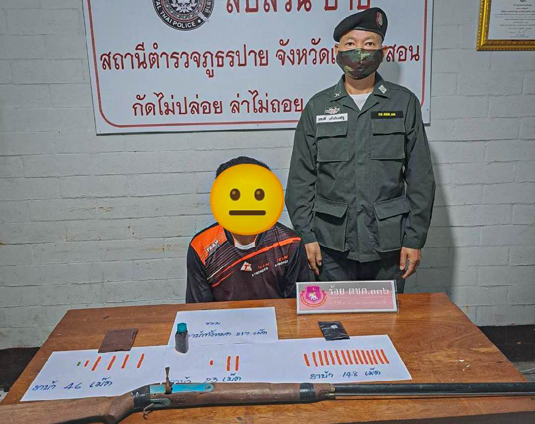 ได้ร่วมกันจับกุม นายองอาจ ยะอนันต์ (อายุ ๔๐ ปี) เลขบัตรประจำตัวประชาชน ๓-๕๘๐๓-๐๐๐๘๒-๘๓-๕ ที่อยู่ ๘๖ หมู่ที่ ๖ ต.เวียงใต้ อ.ปาย จว.แม่ฮ่องสอน