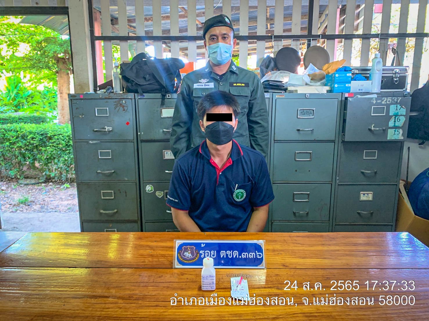 ร่วมกันจับกุมตัว นายธีรพัฒ ขันติ (อายุ ๓๔ ปี) หมายเลขบัตรประจำตัวประชาชน ๑-๕๘๙๙-๐๐๐๕๗-๓๙-๕ ที่อยู่ ๕๕ หมู่ที่ ๒ ต.ผาบ่อง อ.เมือง จว.แม่ฮ่องสอน