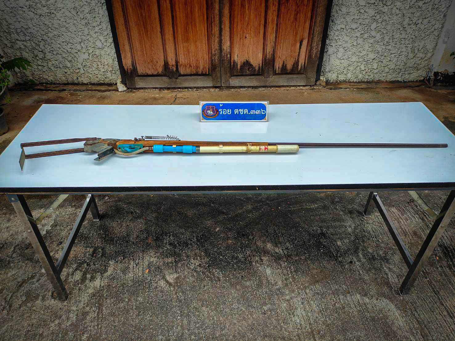 พร้อมด้วยของกลาง อาวุธปืนยาวไทยประดิษฐ์ (ปืนอัดลม) จำนวน ๑ กระบอก