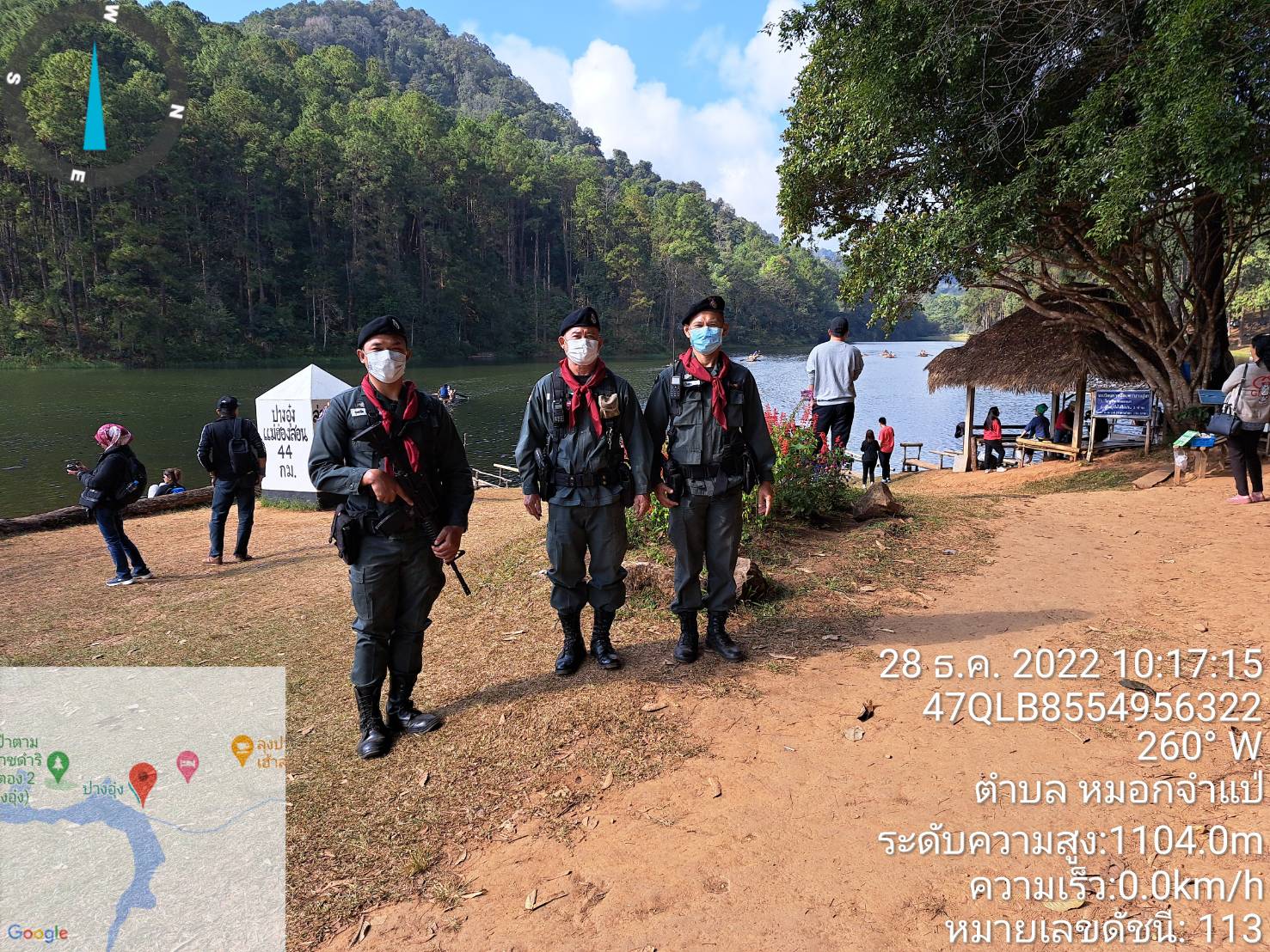 เมื่อ ๒๘๐๙๒๐ ธ.ค. ๒๕๖๕ ร.ต.อ.สุทัศน์ สมฝั้น รอง สว.(ป)กก.ตชด.๓๓/ หน.ชป.ปางโยน ต.หมอกจำแป่ อ.เมือง จว.แม่ฮ่องสอน นำกำลังพล ๔ นายออกลาดตระเวนรักษาความปลอดภัยแก่นักท่องเที่ยว บริเวณลานกางเต็นท์ โครงการพระราชดำริปางตอง ๒ (ปางอุ๋ง) ร่วมกับ จนท.อุทยานแห่งชาติถ้ำปลา- น้ำตกผาเสื่อ จนท.โครงการพระราชดำริฯ พิกัด LB ๘๕๑๓๐๕๖๔๑๑ ม.๕ ต.หมอกจำแป่ อ.เมือง จว.แม่ฮ่องสอน