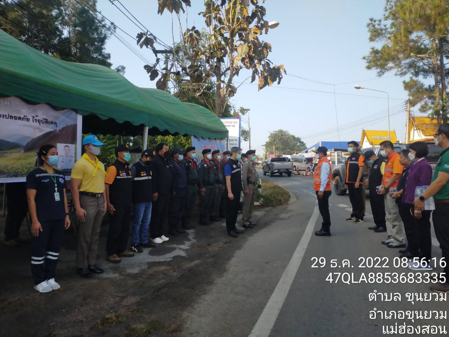 เมื่อ ๒๙๐๘๓๐ ธ.ค. ๖๕ ร.ต.อ.ยอดชัย สร้อยเพชร หน.ชป.ขุนยวม พร้อมกำลังพล ๕ นาย ร่วมกับหน่วยงานราชการในอำเภอขุนยวม ร่วมต้อนรับ นายประเสริฐ จิตต์พลีชีพ รองผู้ว่าราชการ จังหวัดแม่ฮ่องสอน เดินทางมาตรวจเยี่ยมจุดบริการประชาชน และดำเนินการตั้งจุดบริการประชาชน พร้อมทั้งอำนวยความสะดวกด้านการจราจร เพื่อเป็นการป้องกันและลดอุบัติเหตุทางถนนแก่นักท่องเที่ยวที่เดินทางเข้าออกในพื้นที่ จว.แม่ฮ่องสอน ในช่วงเทศกาลปีใหม่ ๒๕๖๖ พร้อมรณรงค์ ขับขี่เดินทางปลอดภัยช่วงเทศกาลปีใหม่ ให้กับประชาชนที่ใช้รถใช้ถนน เพื่อขี่รถด้วยความปลอดภัย ณ หน่วยบริการประชาชนสามแยกอำเภอขุนยวม
